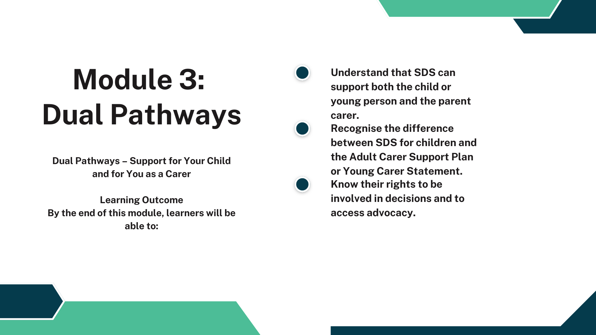 However, SDS isn’t divided into financial vs. medical pathways. Instead, it focuses on who needs the support — your child, you as a carer, or both.