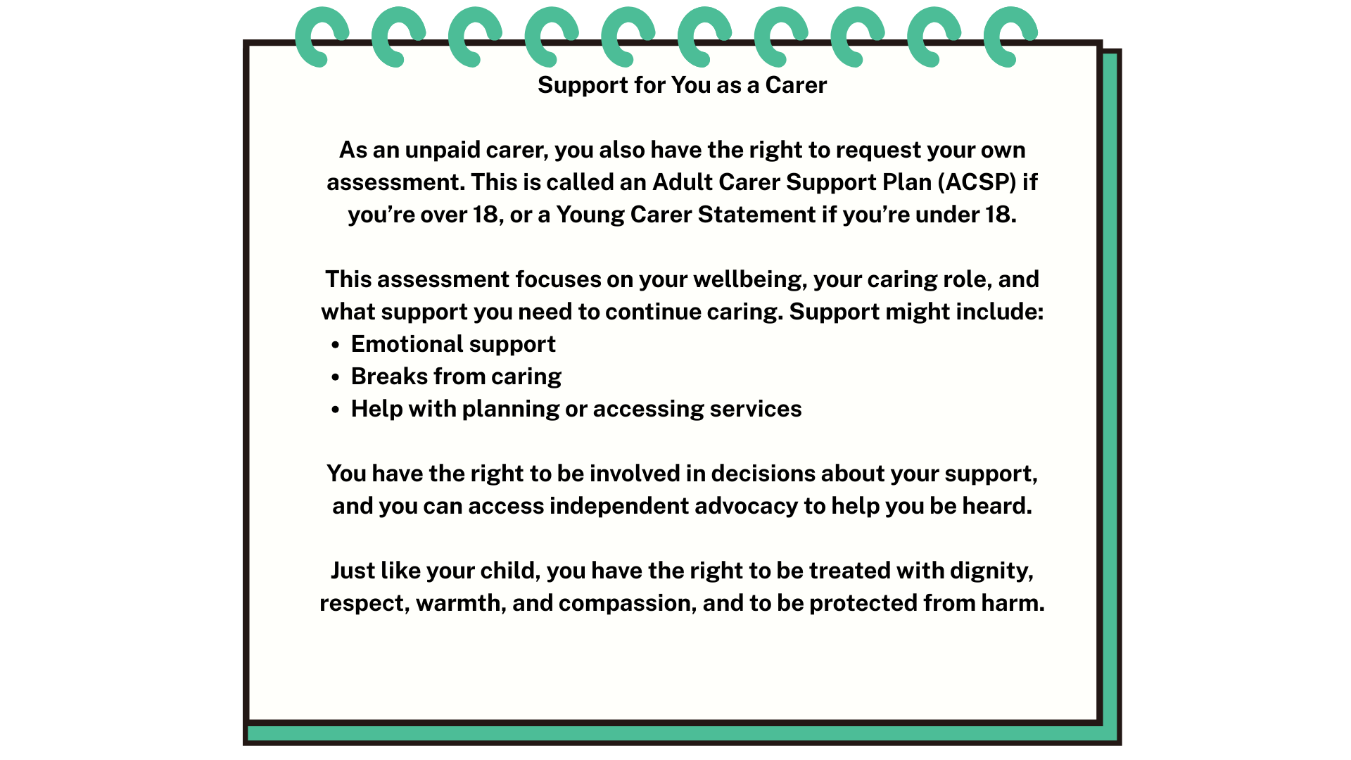 A universal right that applies to both children and carers is being treated with dignity and respect throughout the assessment and support process.