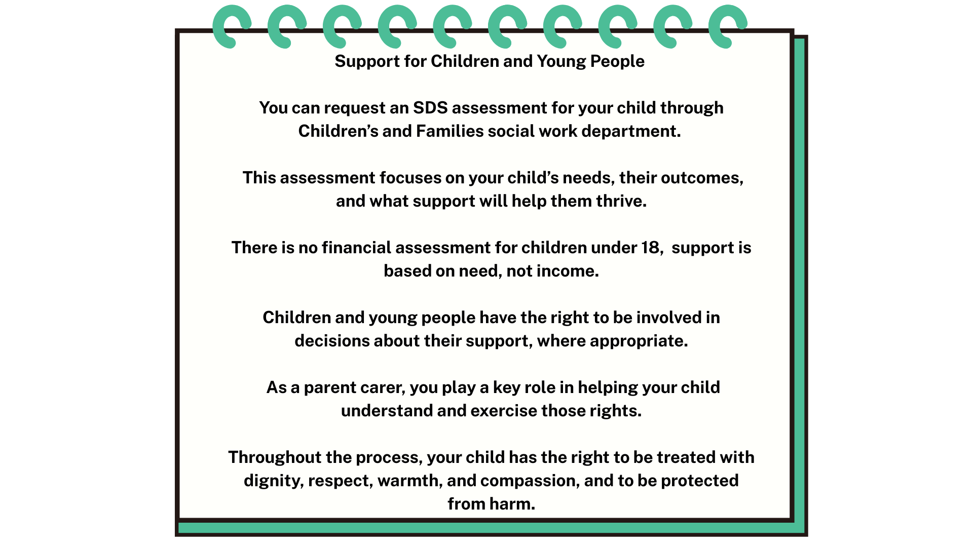 Being treated with dignity and respect is a fundamental right for both children and carers throughout the SDS process. The principles of SDS are built on respect, fairness, and inclusion, ensuring that everyone involved is listened to, valued, and supported in a way that works for them.